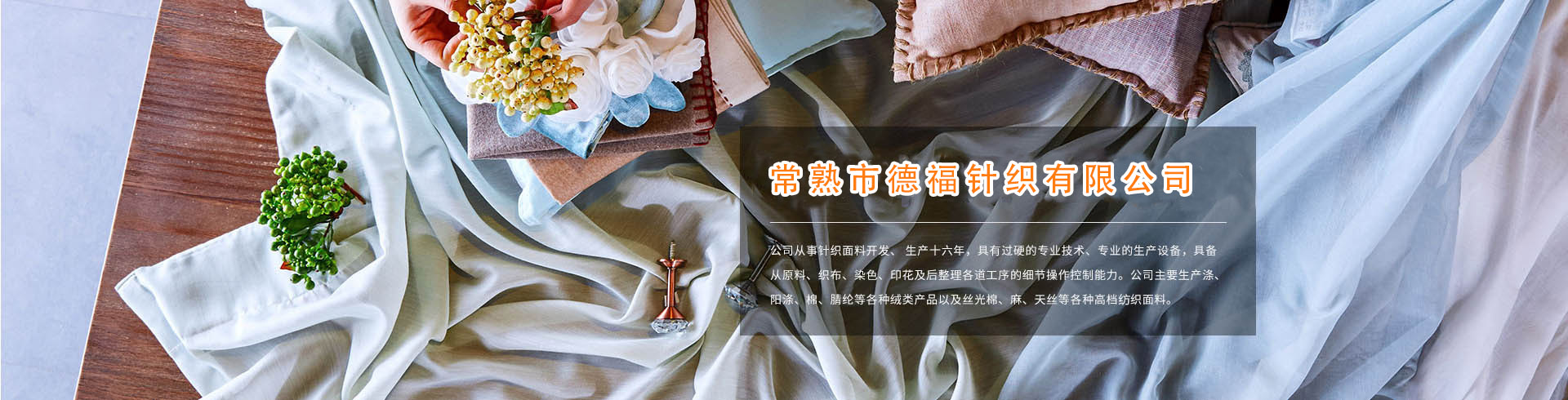 公司從事紡織面料開發、 生產十六年,具有過硬的專業技術、專業的生產設備,具備從原料、織布、染色、印花及后整理各道工序的細節操作控制能力。公司主要生產滌、陽滌、棉、腈綸等各種絨類產品以及絲光棉、麻、天絲等各種高檔紡織面料。